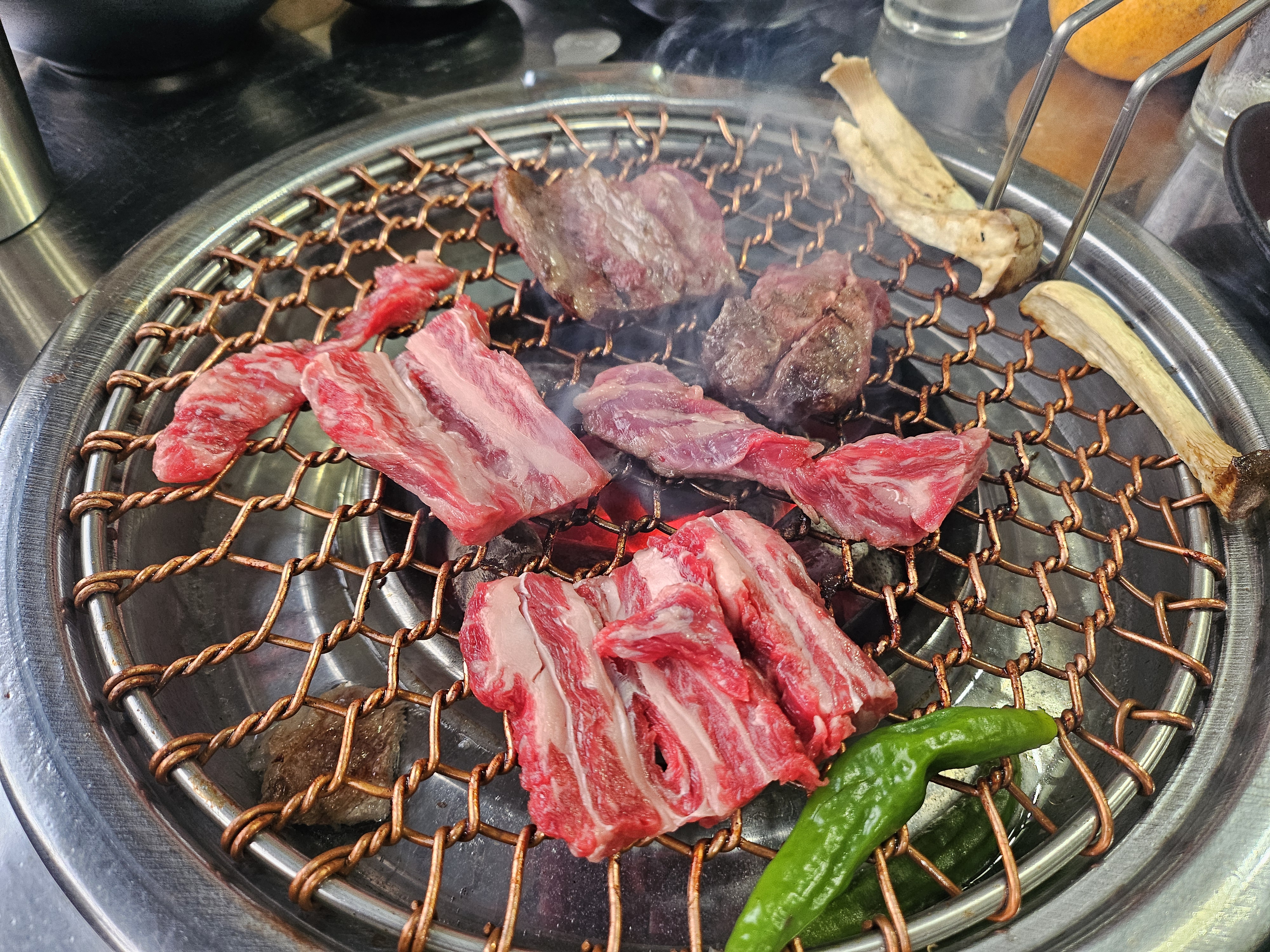 고기를 더욱 맛있게 즐기고 싶다면, 함께 제공되는 명이나물과 고추냉이를 곁들여 보세요. 고기의 풍미를 한층 살려주는 이 조합은 단맛, 짠맛, 그리고 매콤함의 균형을 완벽하게 잡아줍니다. 갈빗살과 등심 모두 이 조합으로 즐길 때 고유의 맛을 더욱 풍부하게 느낄 수 있습니다.