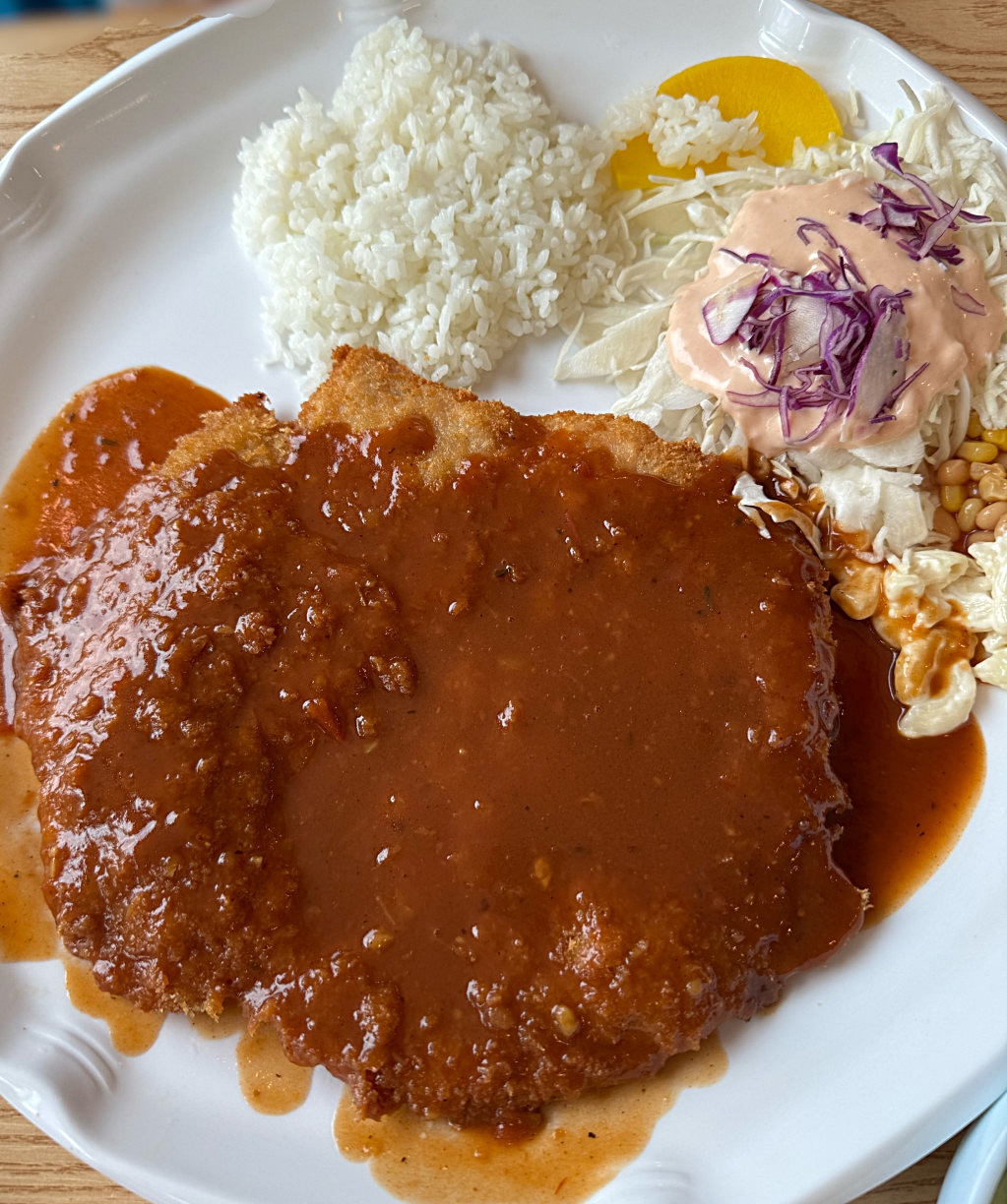 식사를 시작하기 전, 제공되는 크림 수프는 따뜻하고 부드러운 맛으로 식욕을 돋워줍니다. 돈가스와 함께 나오는 밑반찬으로는 오이냉국, 깍두기, 그리고 풋고추가 준비되어 있는데, 고기의 느끼함을 잡아주는 상큼한 오이냉국과 아삭한 깍두기가 훌륭한 조화를 이룹니다. 한국식 반찬과 서양식 돈가스의 만남이 독특한 미각 경험을 제공합니다.